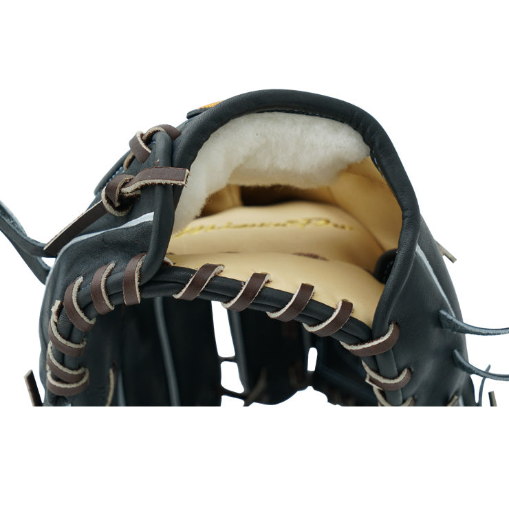 深いポケットで、打球を確実につかみやすいモデル。小指2本入れでの使用を想定した、小指穴広めの形状。