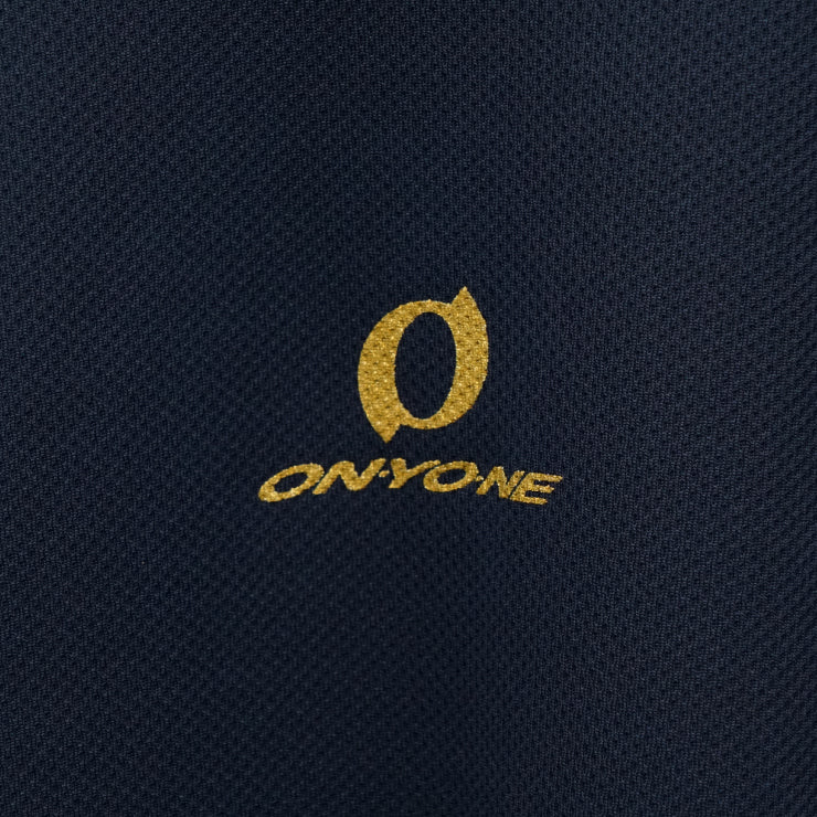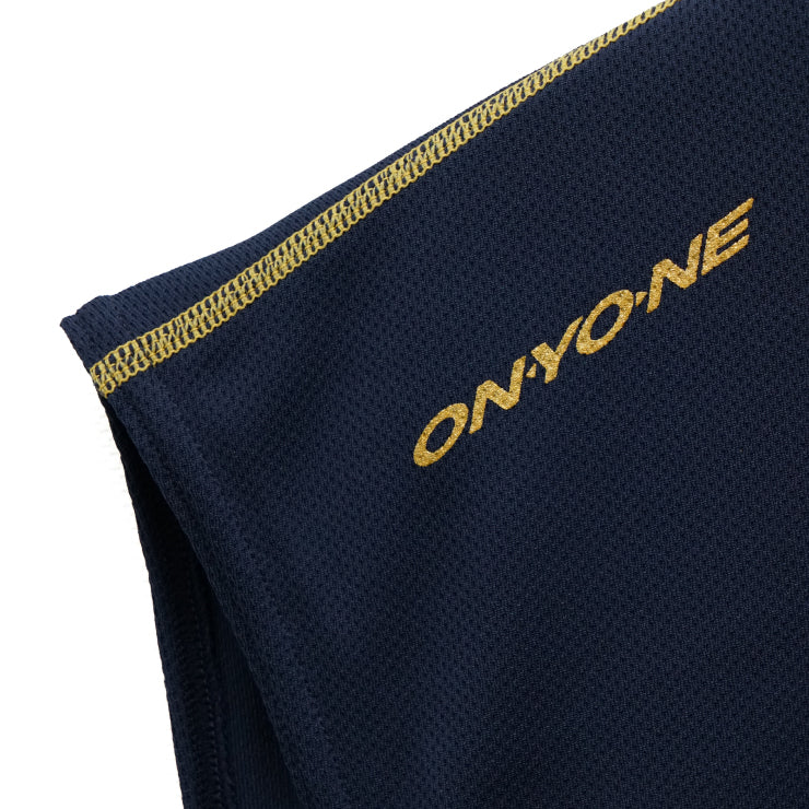 胸中央部にはオーバルマーク、右肩にはオンヨネロゴ、縫い糸ゴールドの特別仕様。一枚でトレーニングウェアとしての着用も◎です。