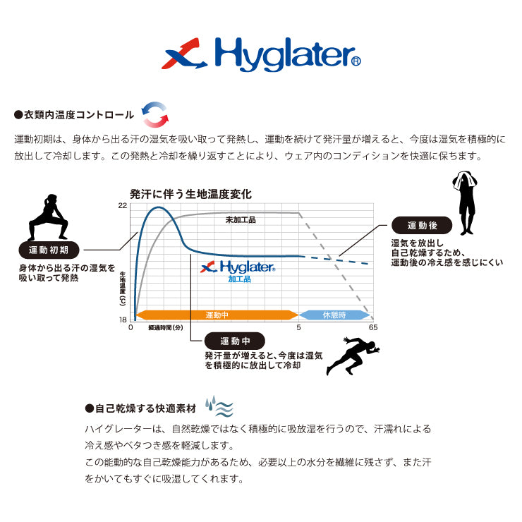 少量の発汗では発熱し、発汗量が増えてくると湿気を放出して冷却。衣服内の温度を快適にコントロールします。