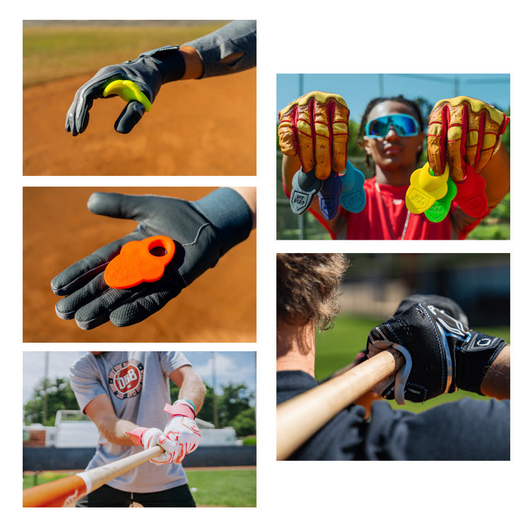 バッティング時に親指に装着して使用。マルチポジション設計で、人差し指にも装着可能です。
