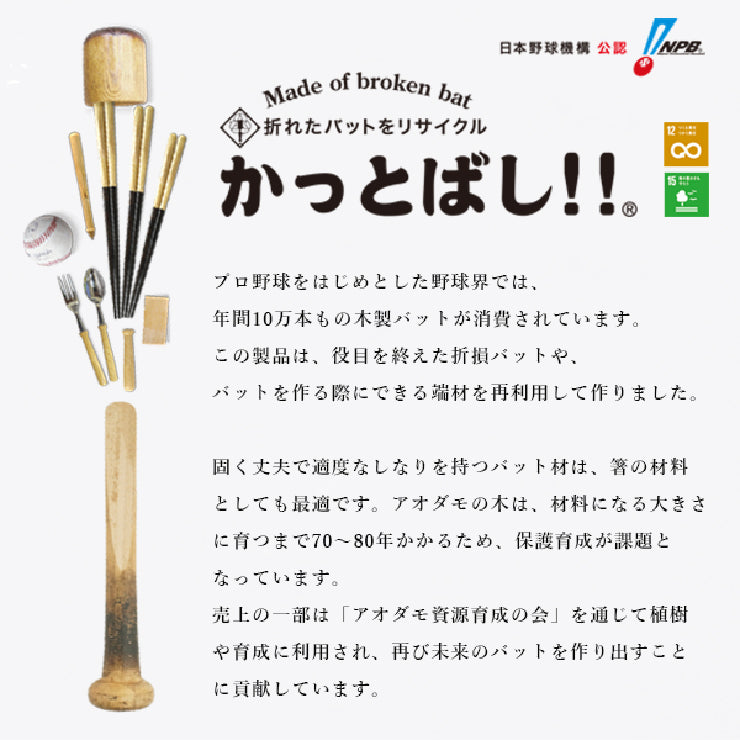折れたバット・不要になったバットから作られた箸「かっとばし」です。
